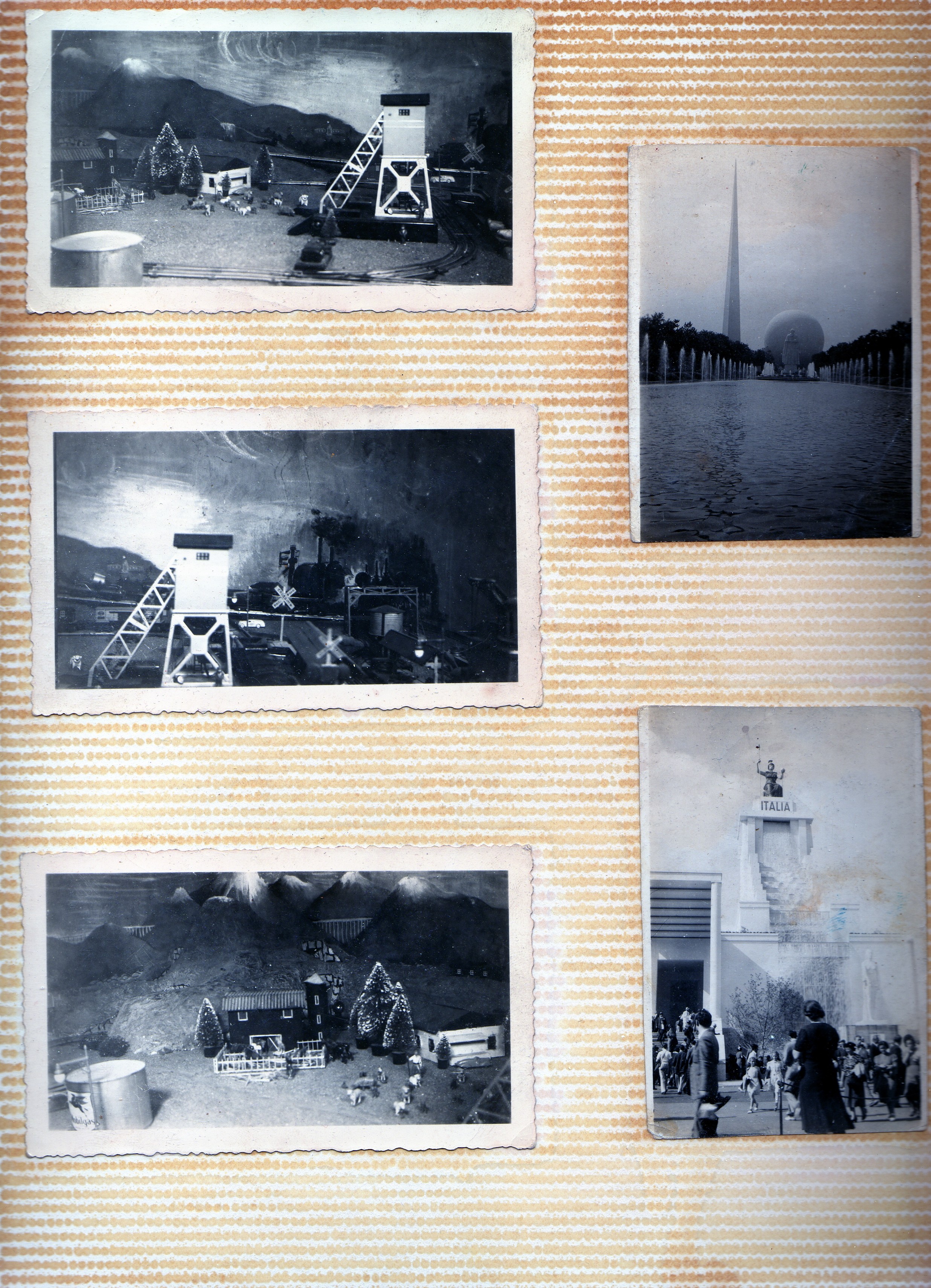 Two pictures on the left are of our train layout. In 1943 my cousin Johnny and I put up the trains for Christmas. My brother was away in the Army. On the right are two photos taken by myself of the 1939 New York Worlds Fair. I thought the Trylon and Perisphere were awesome and they were. The other photo is of the Italian building at the fair. It had that high waterfall coming down the front of the building, spectacular!!!